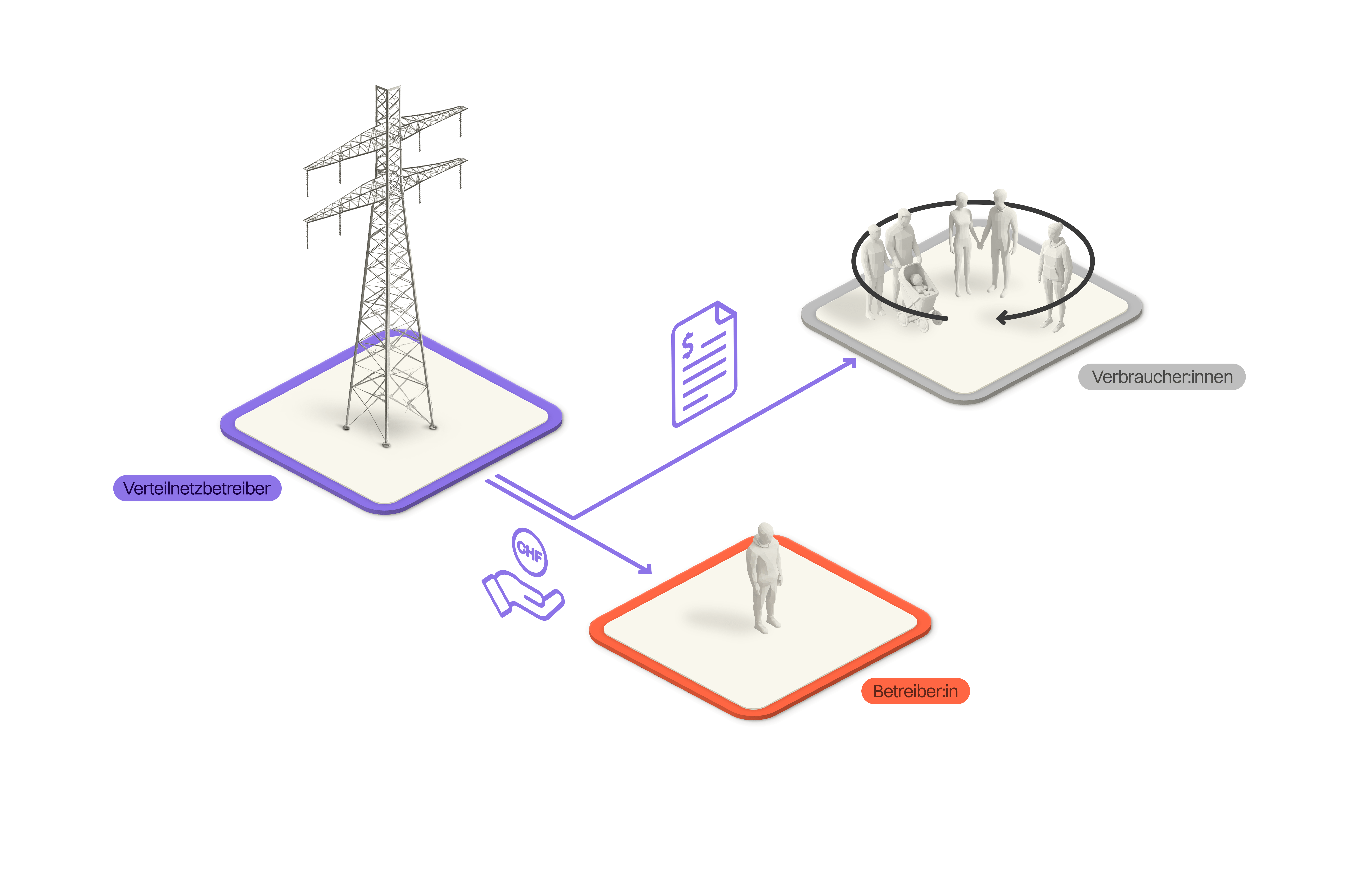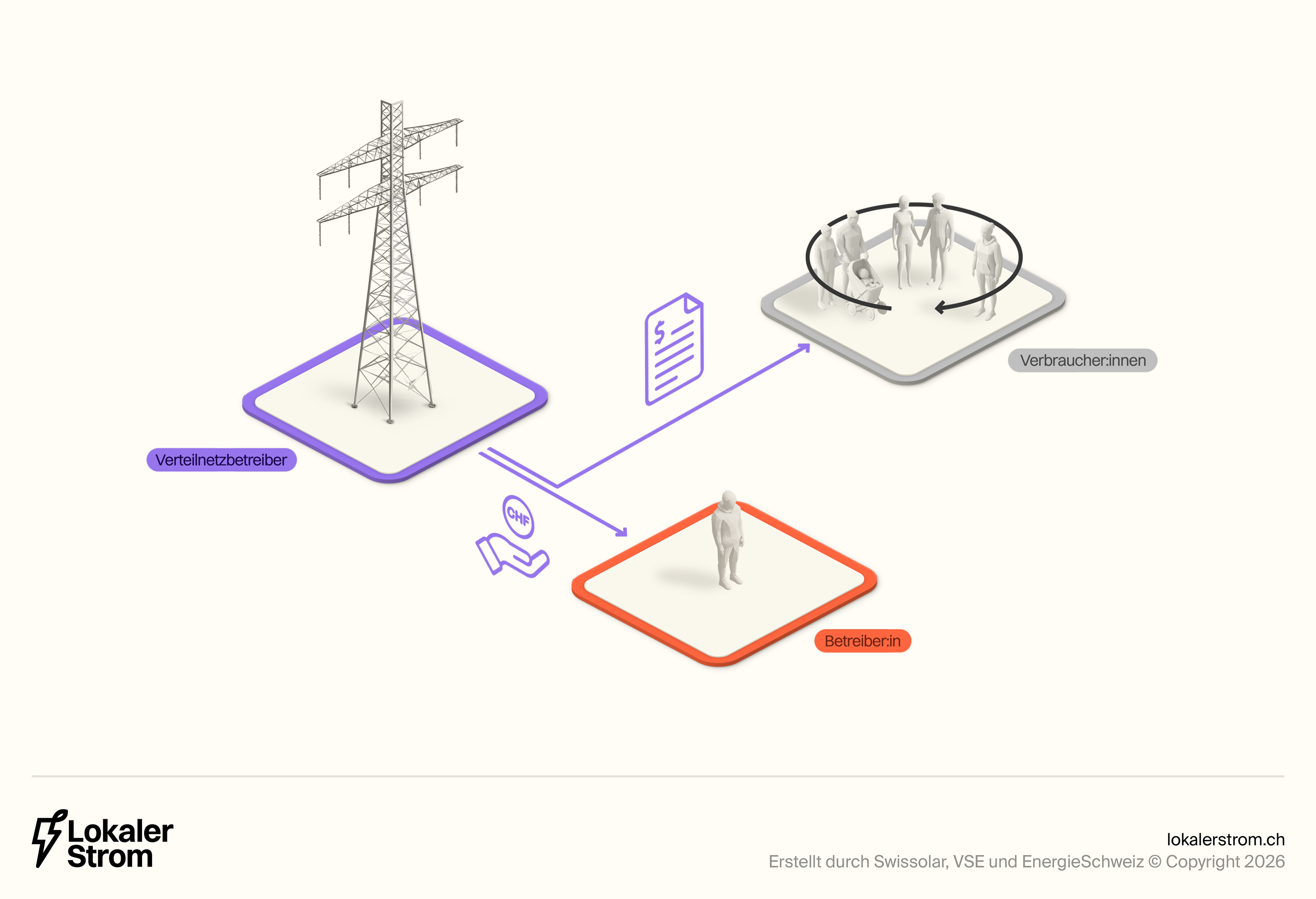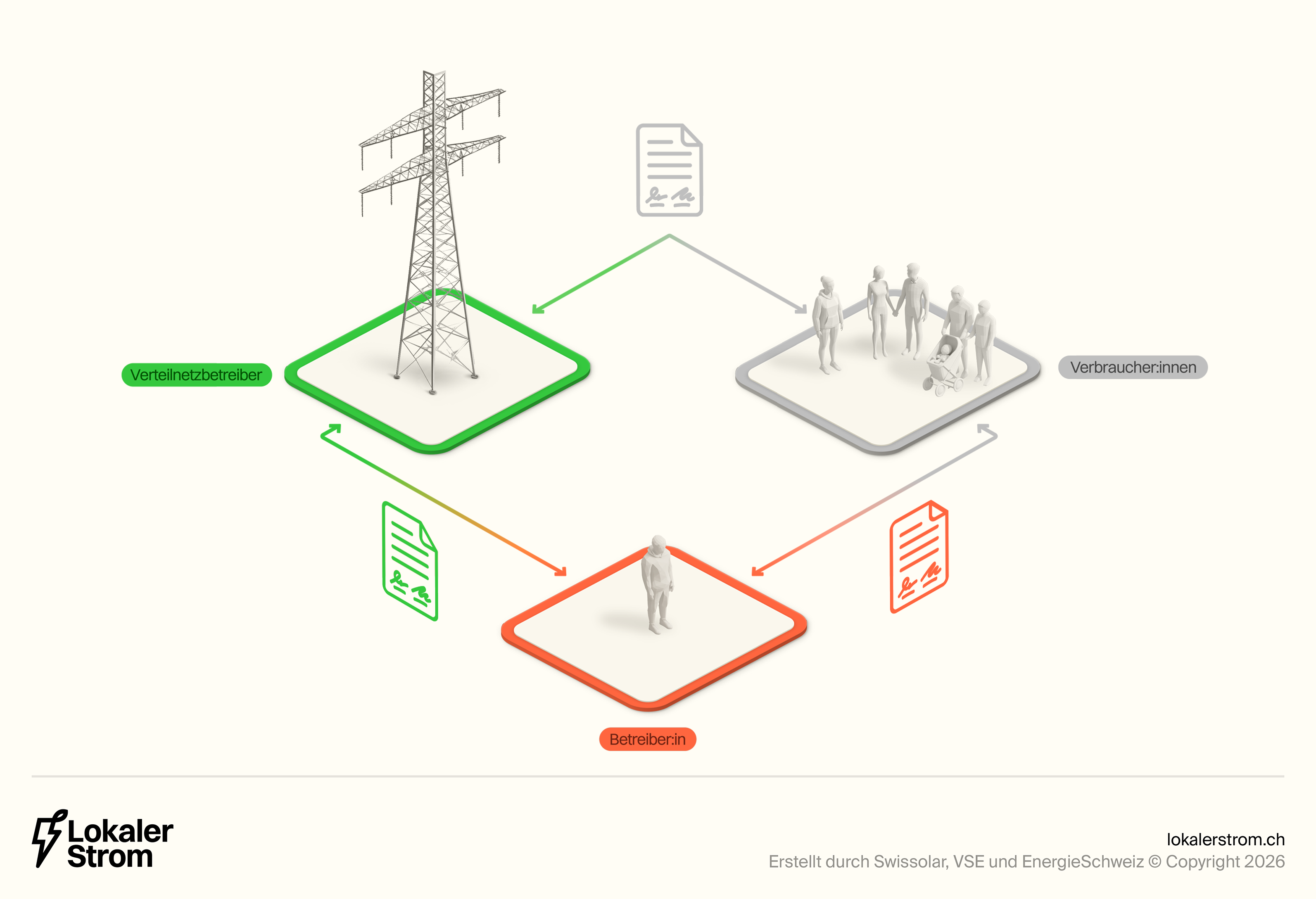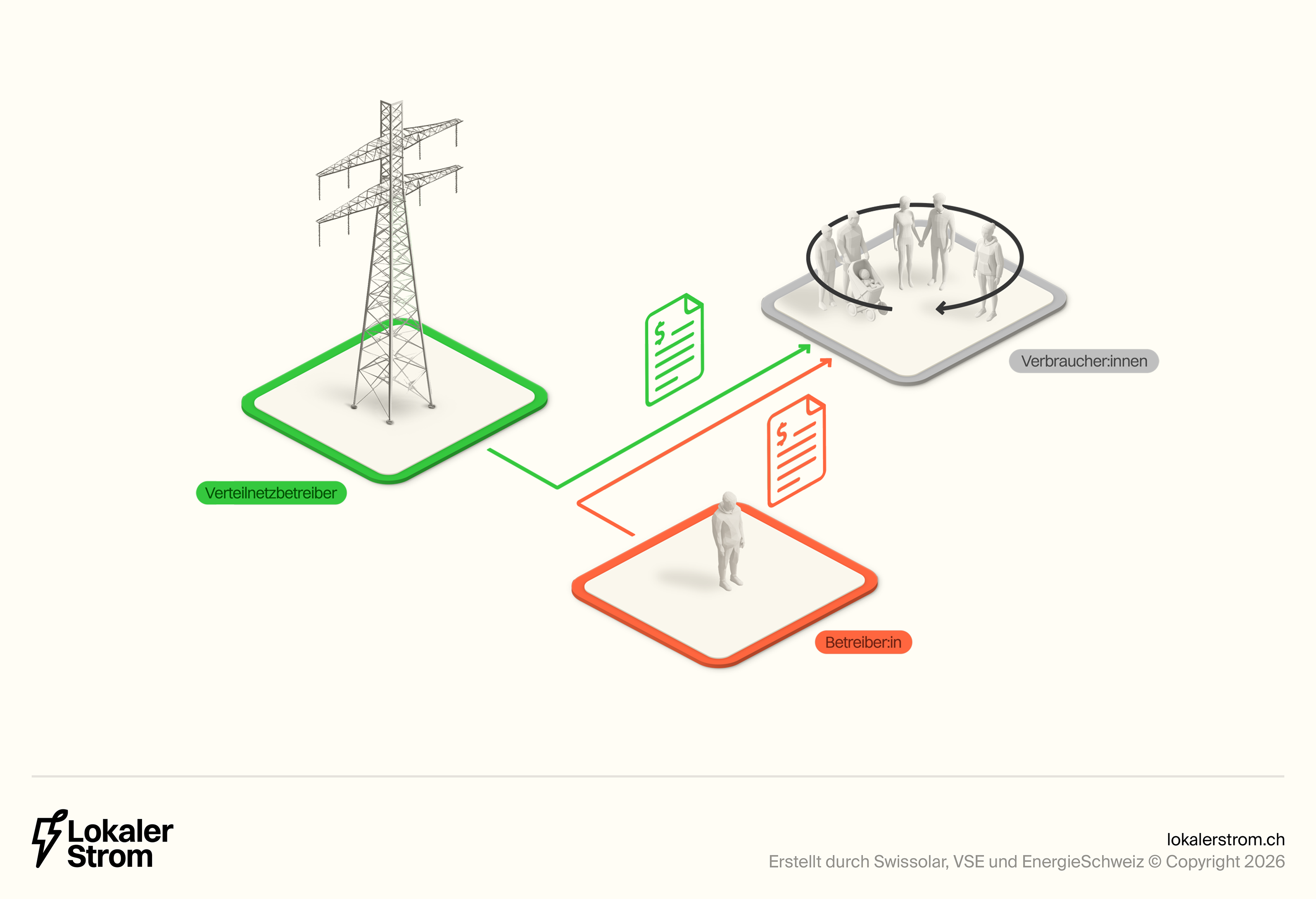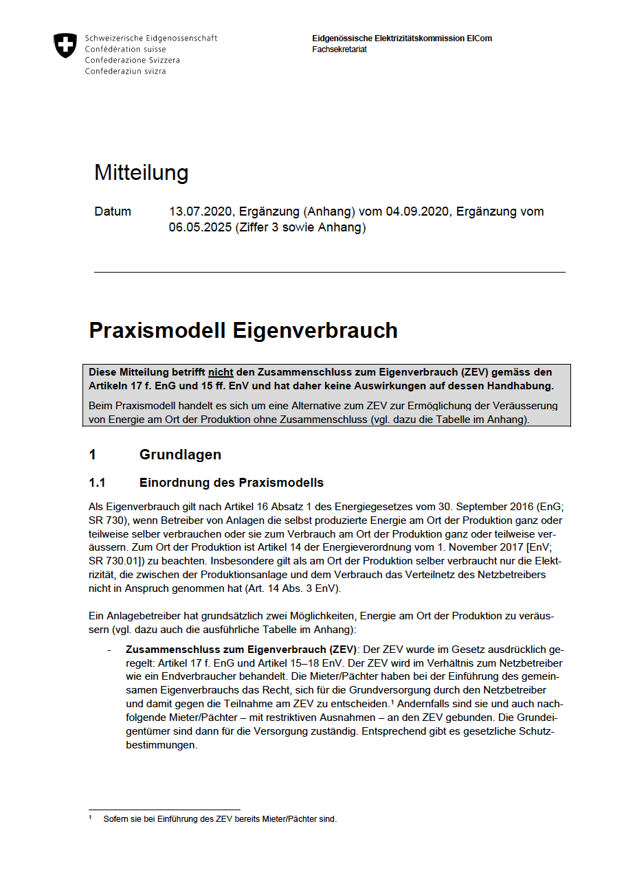 Die Verteilnetzbetreiber (VNB) können mit dem Praxismodell (auch unter anderen Namen wie Eigenverbrauchsgemeinschaft bekannt) ebenfalls eine Abrechnungslösung anbieten. Sie sind aber nicht verpflichtet, ein solches Modell anzubieten. Bei der Umsetzung gibt es Gestaltungsspielraum, wobei die Weisung der Eidgenössischen Elektrizitätskommission (ElCom) beachtet werden muss. Der VSE empfiehlt zudem, sich bei der Ausgestaltung der Regeln an den anderen Modellen zu orientieren, beispielsweise bei der Festlegung der minimal notwendigen Produktionsleistung oder der Tarifgestaltung. Ein grosser Unterschied zum ZEV und vZEV ist, dass die Teilnehmenden hierbei Kunde ihres Verteilnetzbetreibers bleiben.