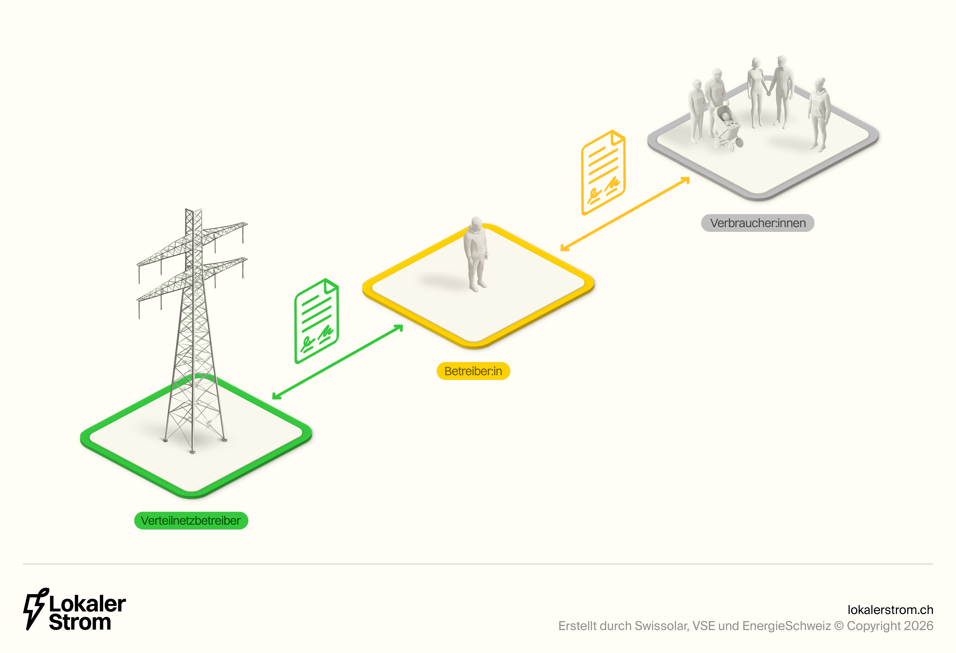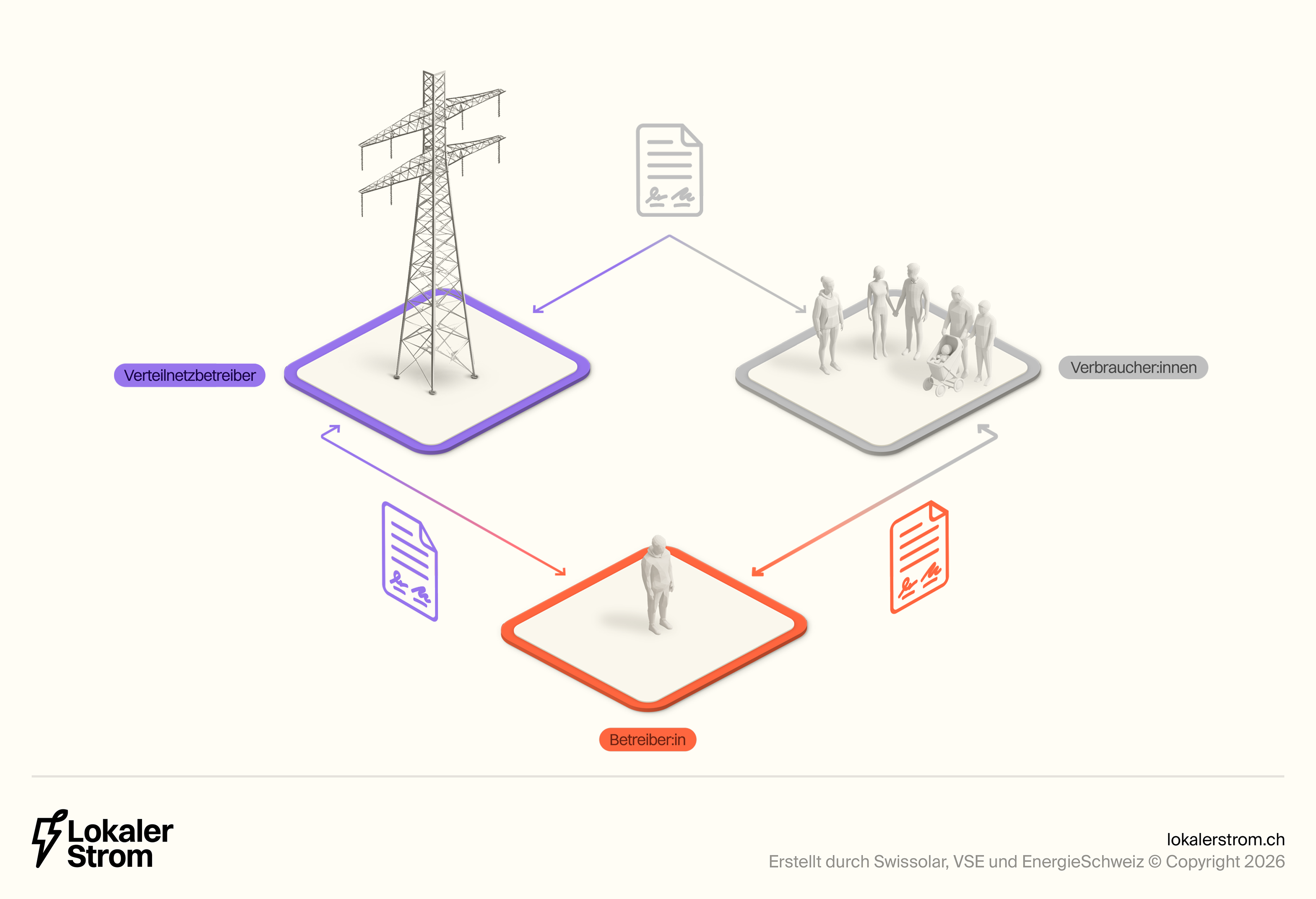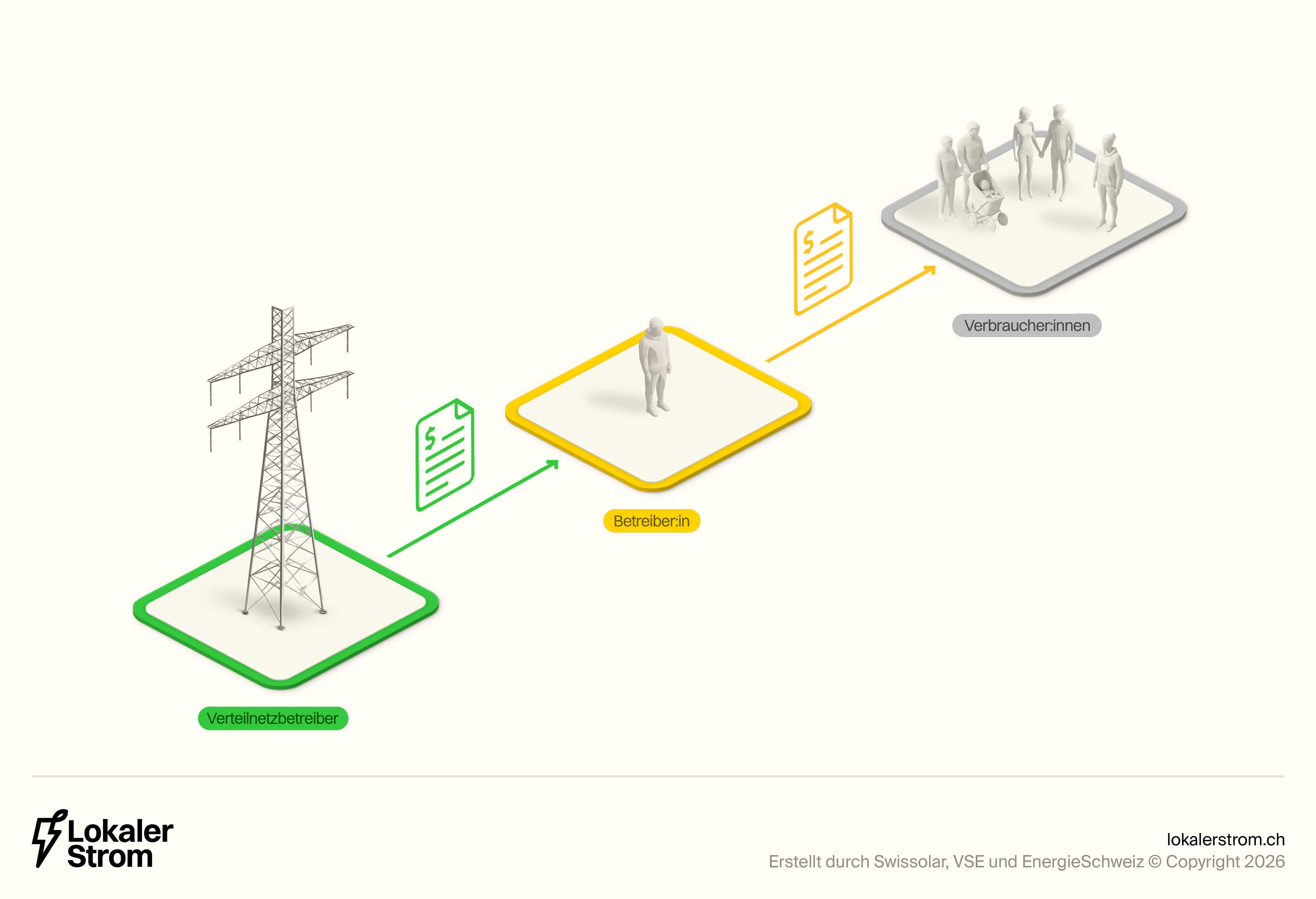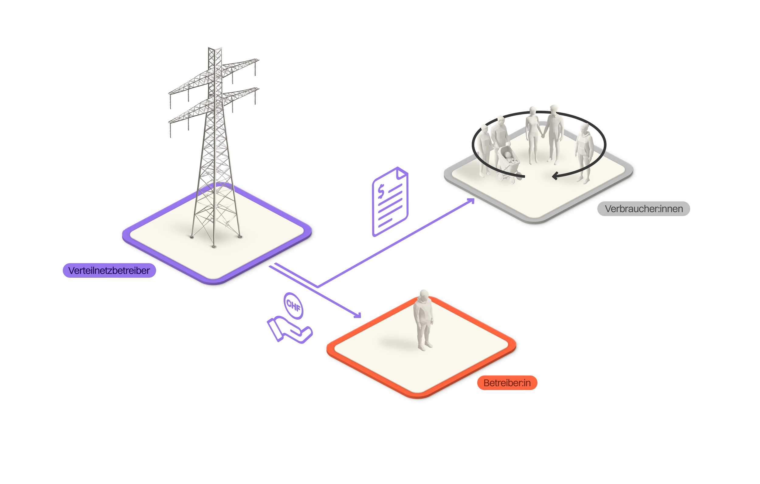 Die Verteilnetzbetreiber (VNB) können mit dem Praxismodell (auch unter anderen Namen wie Eigenverbrauchsgemeinschaft bekannt) ebenfalls eine Abrechnungslösung anbieten. Sie sind aber nicht verpflichtet, ein solches Modell anzubieten. Bei der Umsetzung gibt es Gestaltungsspielraum, wobei die Weisung der Eidgenössischen Elektrizitätskommission (ElCom) beachtet werden muss. Der VSE empfiehlt zudem, sich bei der Ausgestaltung der Regeln an den anderen Modellen zu orientieren, beispielsweise bei der Festlegung der minimal notwendigen Produktionsleistung oder der Tarifgestaltung. Ein grosser Unterschied zum ZEV und vZEV ist, dass die Teilnehmenden hierbei Kunde ihres Verteilnetzbetreibers bleiben.