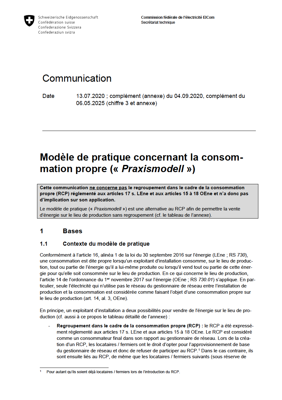 La conception des modèles de pratique n’est pour l’instant soumise à aucune disposition légale ni à aucune ordonnance, mais il existe des communications de l’ElCom concernant les exigences pour une mise en œuvre conforme à la loi.
