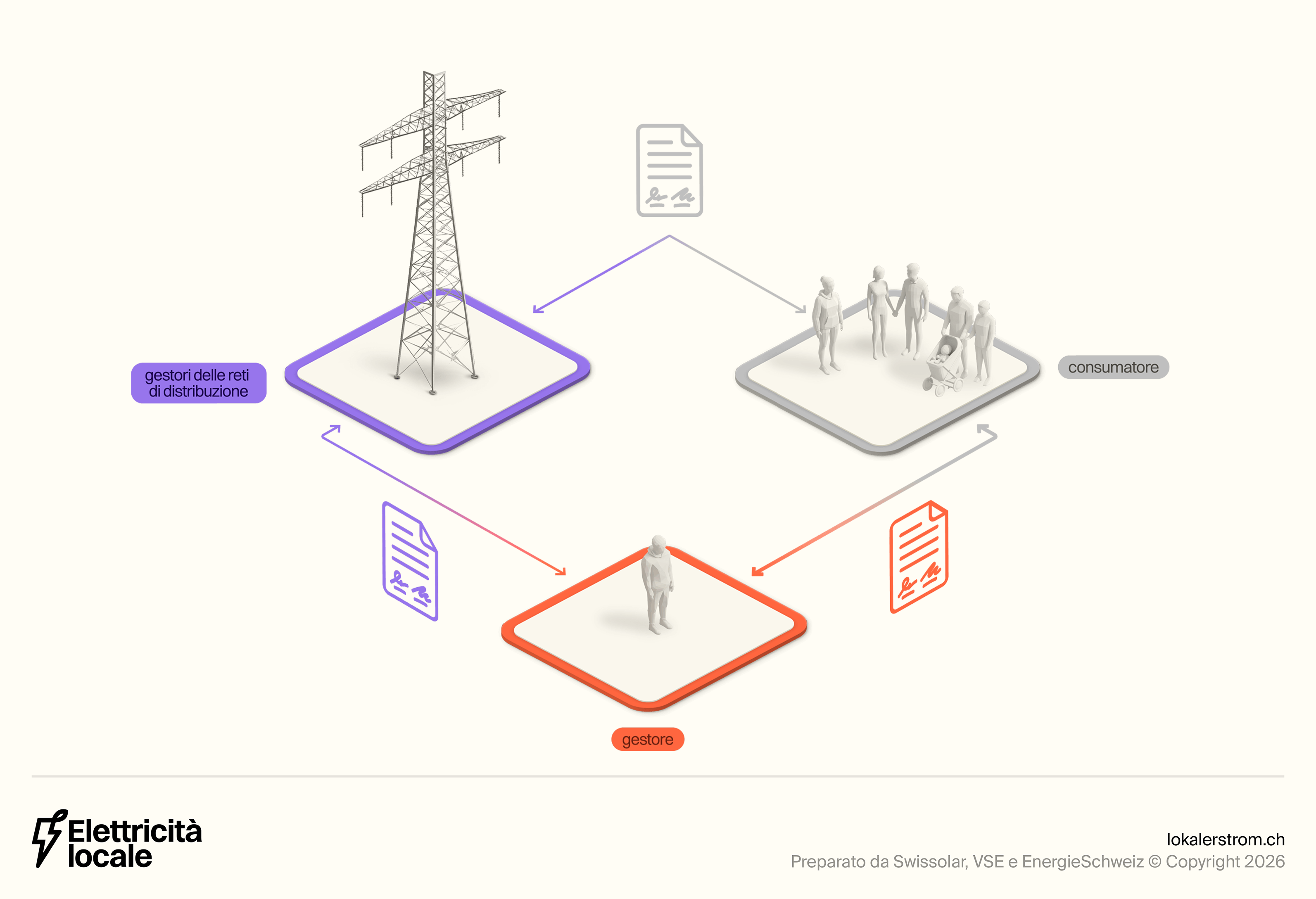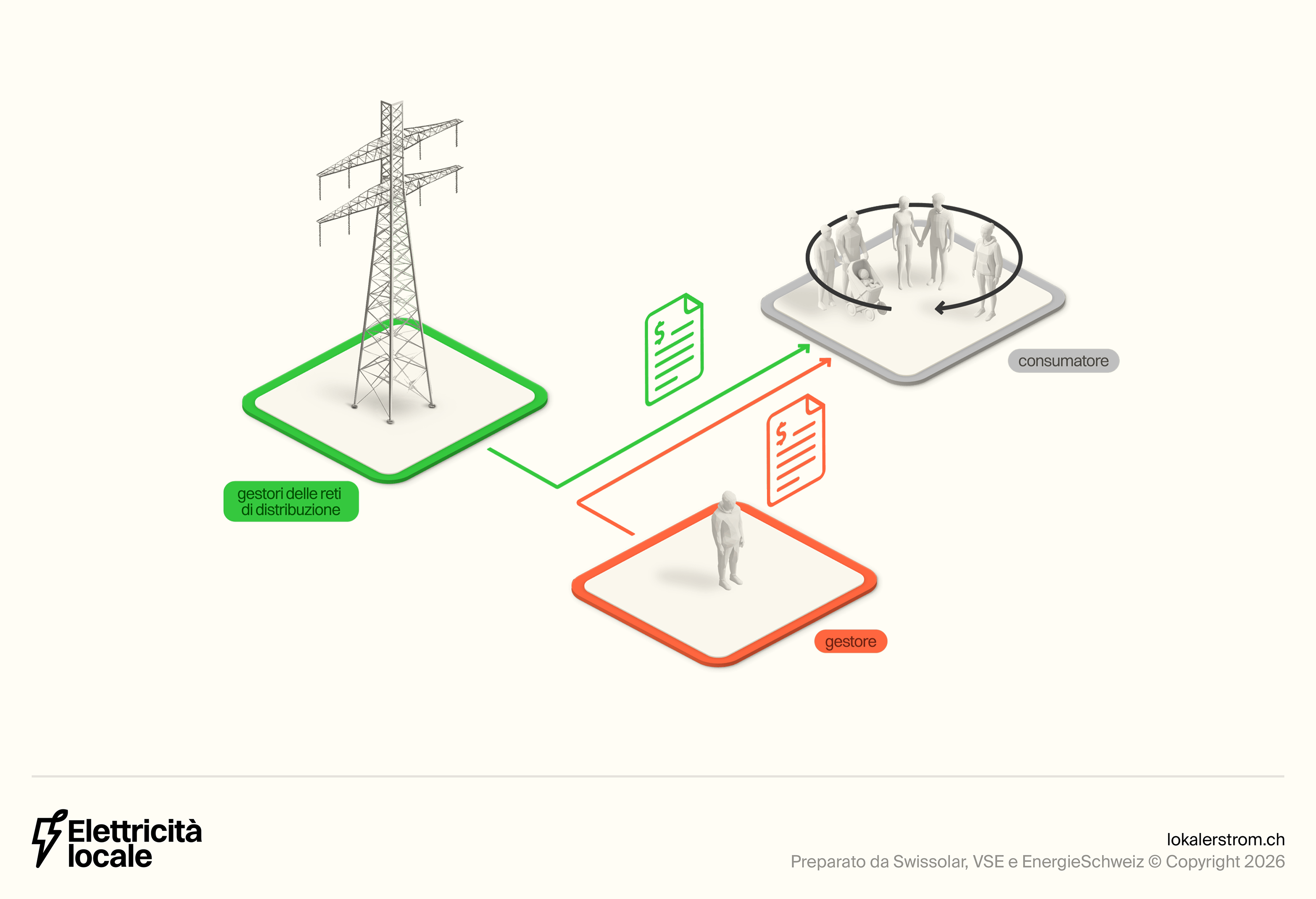 Anche i gestori della rete di distribuzione (GRD) possono offrire una soluzione di fatturazione con il modello di applicazione (noto anche con altri nomi, come comunità di consumo proprio). Tuttavia, non sono obbligati a proporre un tale modello. Nell’attuazione vi è un margine di manovra, pur dovendo osservare le disposizioni della Commissione federale dell’energia elettrica (ElCom). L’AES raccomanda inoltre di orientarsi su altri modelli per l’allestimento delle regole, ad esempio per quanto riguarda la determinazione della potenza di produzione minima necessaria o la struttura delle tariffe. Una grande differenza rispetto ai RCP e ai RCPv è che i partecipanti rimangono clienti del loro GRD.